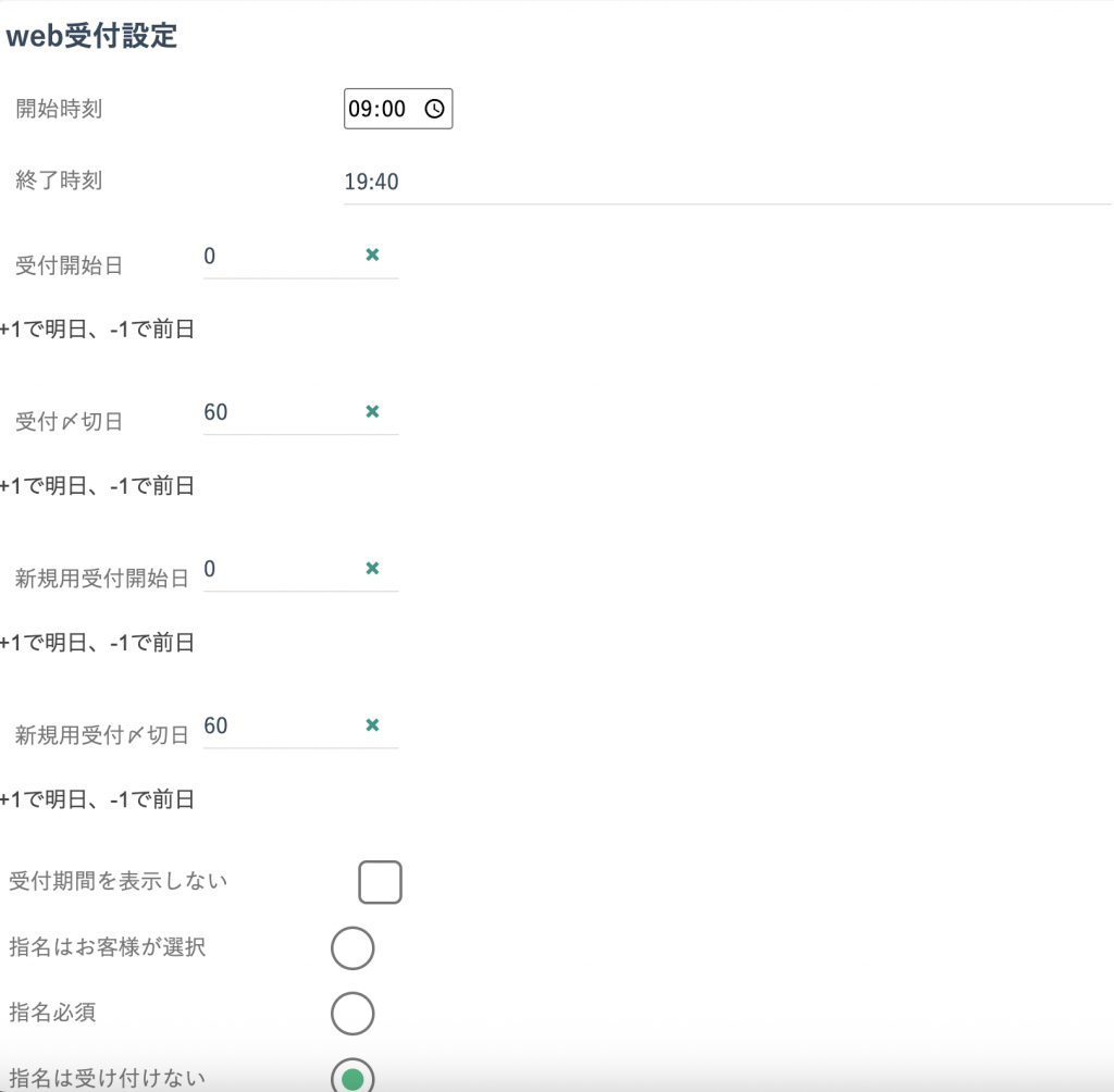 お客様からの予約を受け付ける開始日を設定します。0にすると当日からになります。