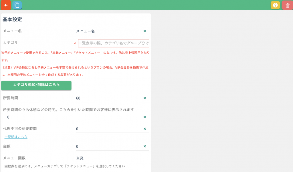 メニュー名・所要時間・料金を設定をします