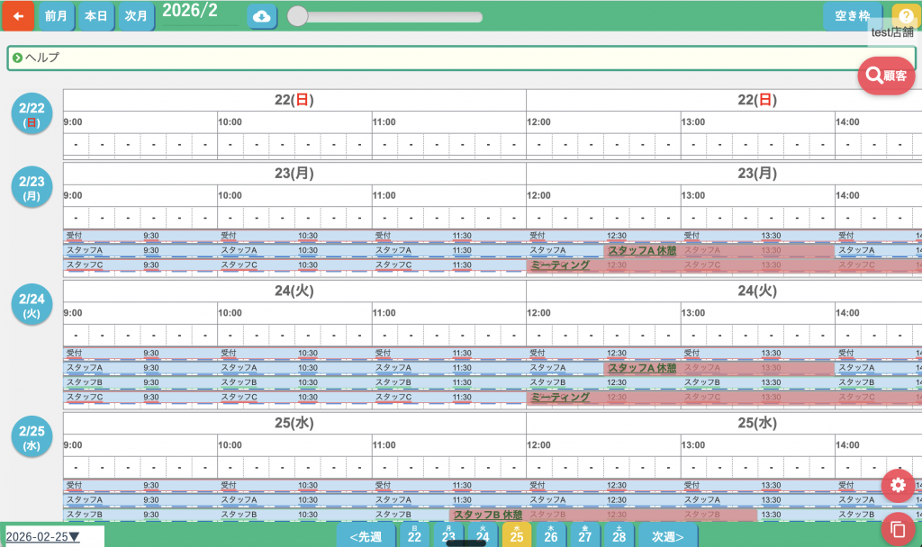 担当者を選ばずに予約された場合は、予約表上の 「フリー」 という欄に反映されます。