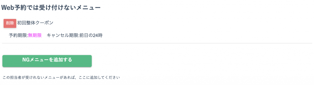 NGメニューを追加していくことで、この担当者を指名した場合に、予約が取れなくなります。