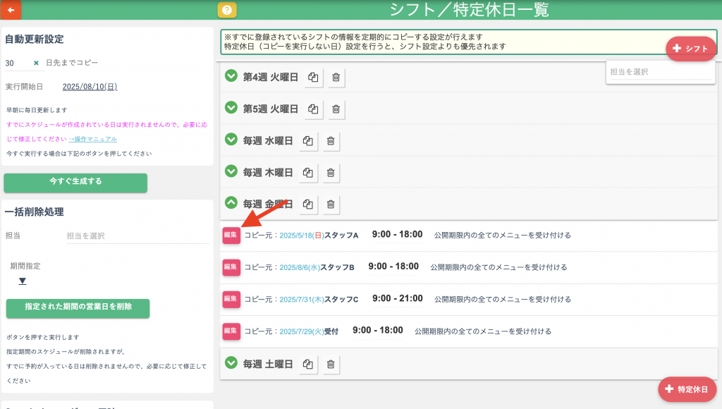 (※予約が1件でもある日は削除できないため、スケジュール表から、該当日をクリックして手動で修正します)