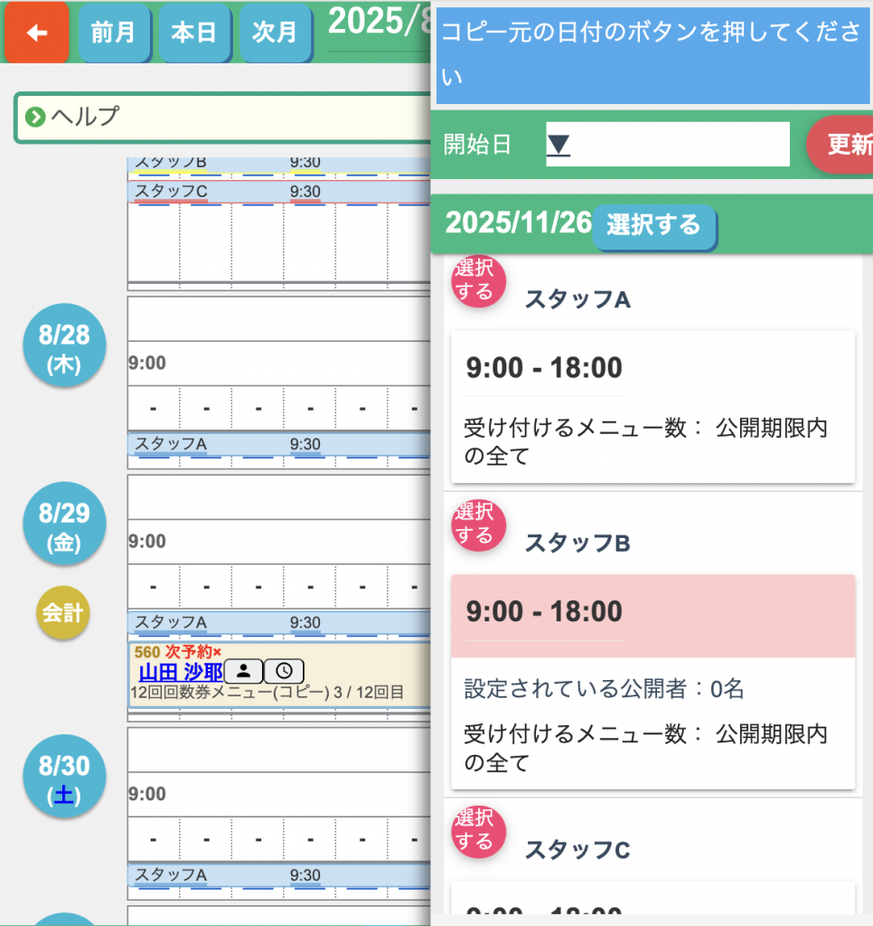 予約表上は当月も削除されず、来月分のシフトが自動更新されます。