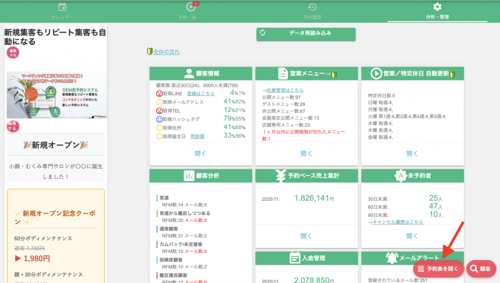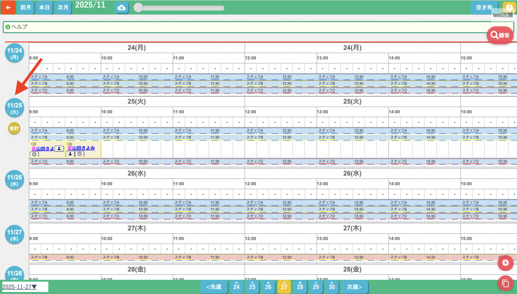 (※予約が1件でもある日は生成されないため、スケジュール表から、該当日をクリックして手動で修正します)