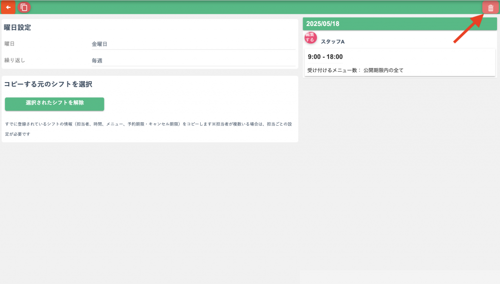 画面、右上のゴミ箱マークをクリックしてシフトの削除をします。