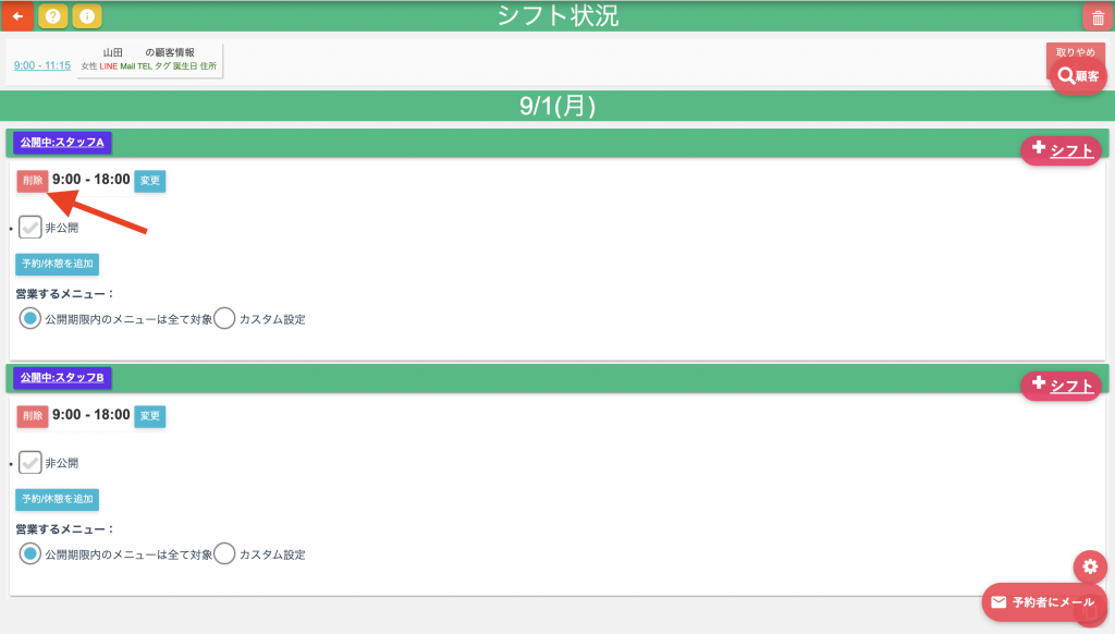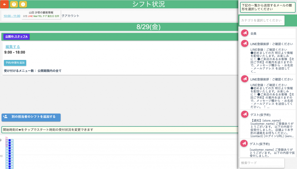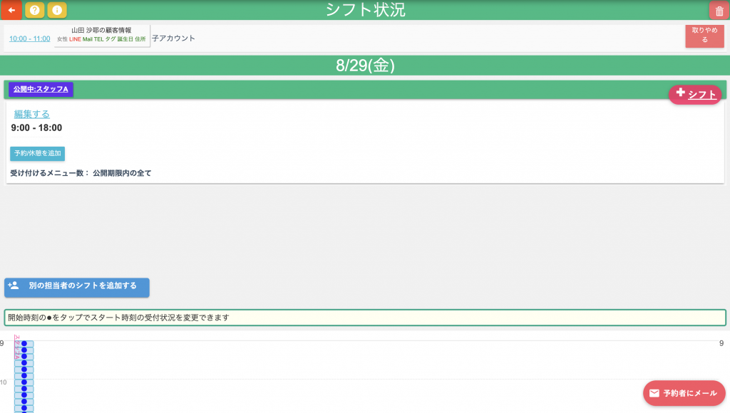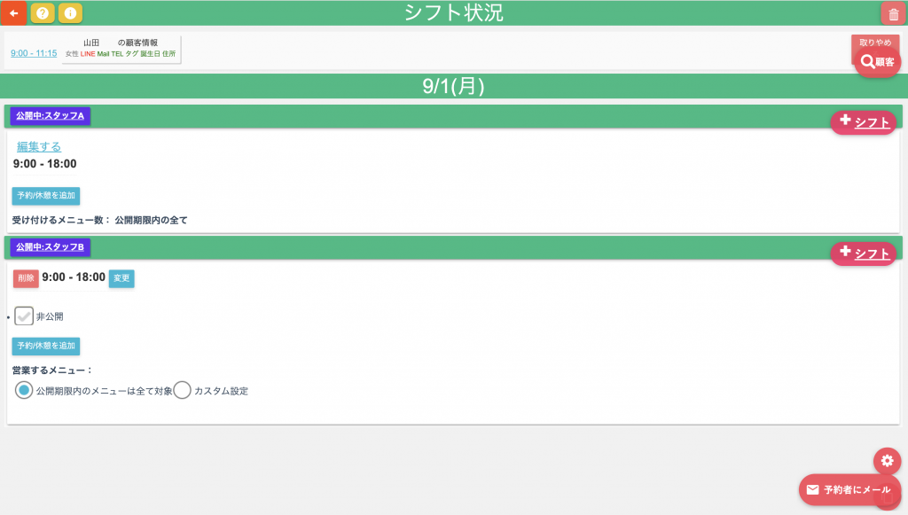 シフト状況の画面で、予約者へ直接メールを送信できます。