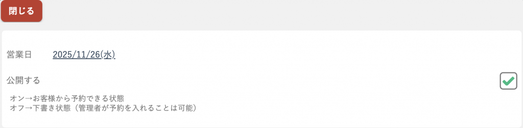 ただし、予約が入っている日のスケジュールは消えませんので、該当日の詳細画面より手動で変更してください