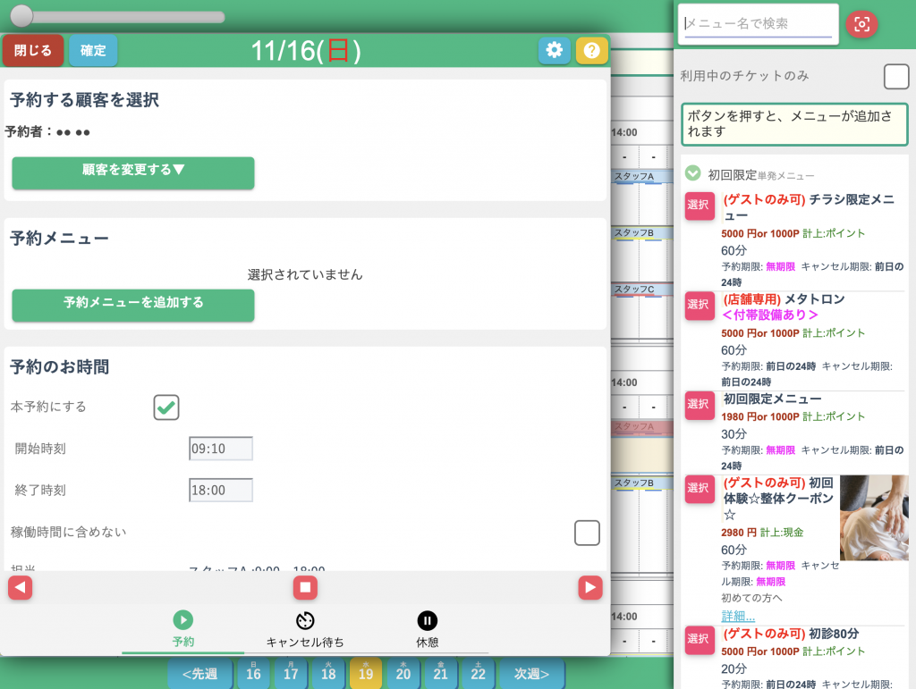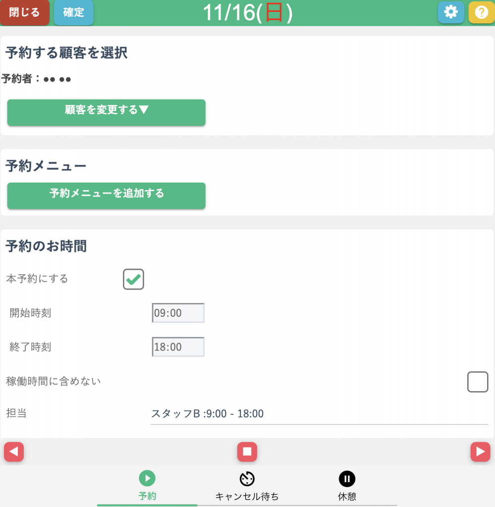 キャンセル待ちされるお客様のお名前と施術時間を入力し、確定をクリックします。