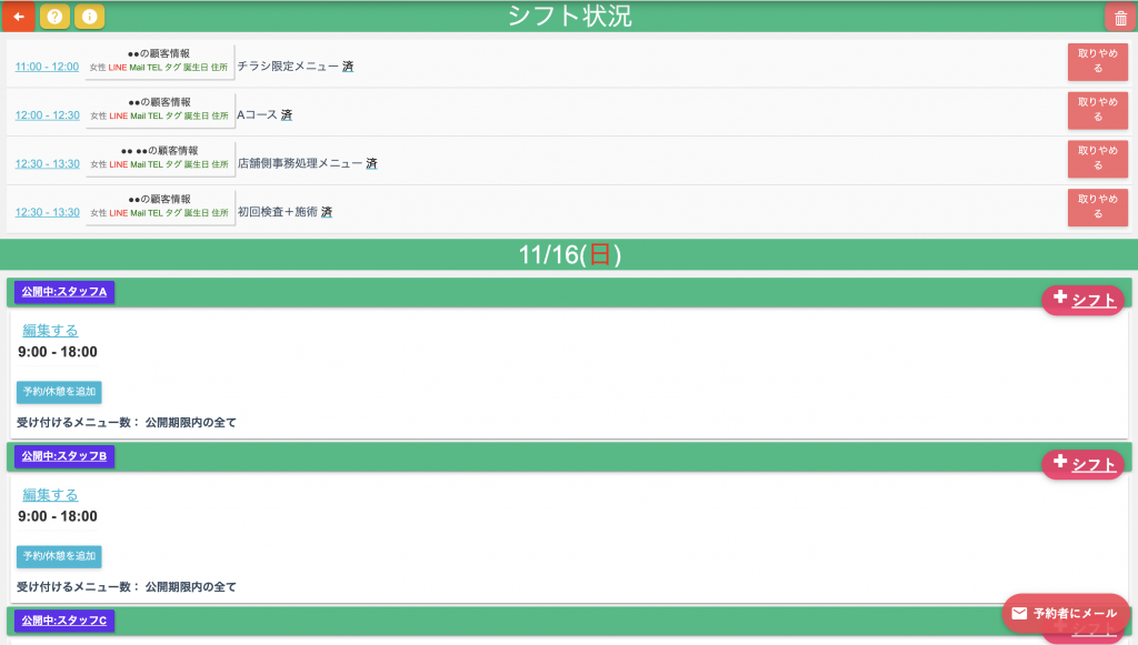 ピンクのシフトは、特定の方のみネット予約が行えます。
