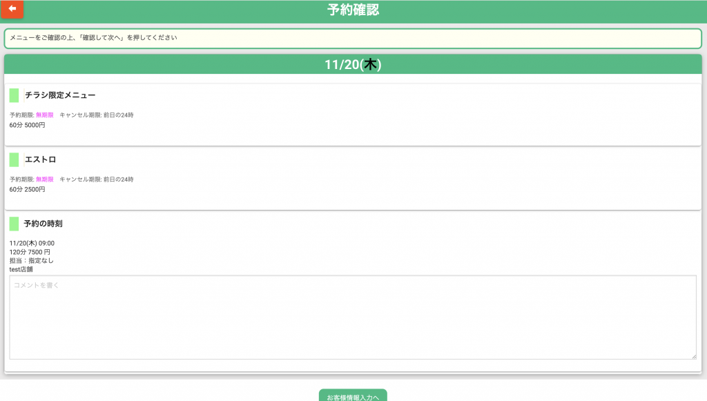 ※ただし、施術メニューの消費時間が異なる場合は、元の予約時間の変更も必要に応じてお願いします。