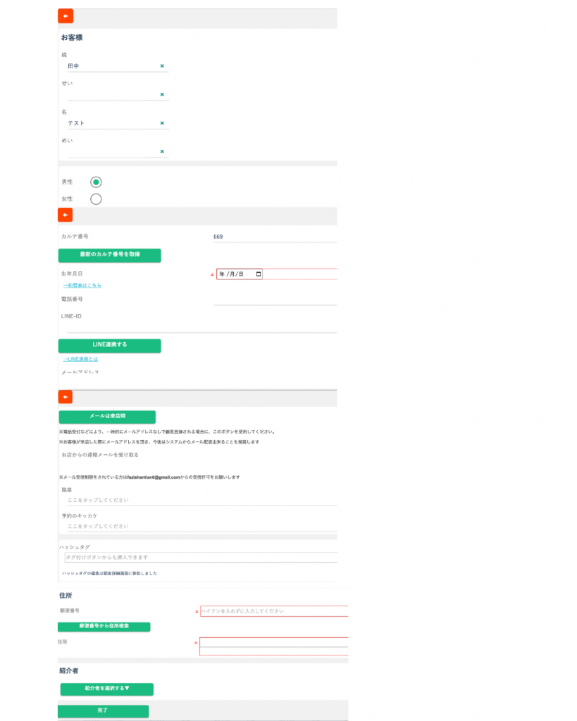 「メールは来店時」ボタンを押すと、管理者(店舗)のメールアドレスが入力されます。