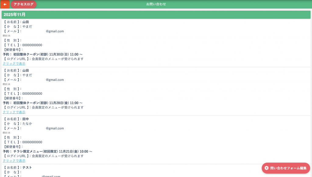 お問い合わせ一覧より、新規のお客様の情報を確認できます。